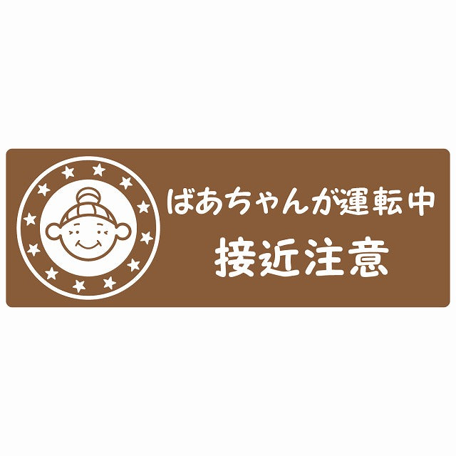 高齢者 シルバー ばあちゃんが運転中 接近注意 顔マーク ブラウン ステッカー 14x5cm 長方形