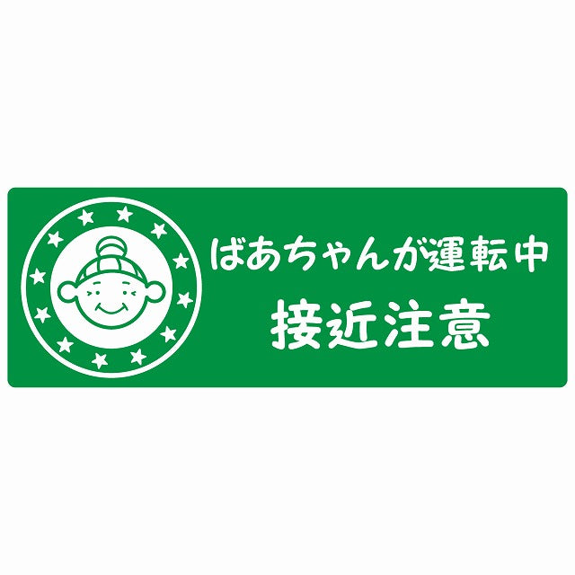 高齢者 シルバー ばあちゃんが運転中 接近注意 顔マーク グリーン ステッカー 14x5cm 長方形