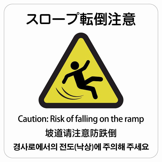スロープ転倒注意 多言語 英語 中国語 韓国語 対応 ステッカー 正方形
