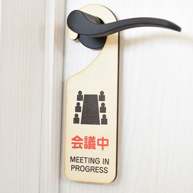会議中 MEETNING IN PROGRESS 吊り下げ 木製ドアプレート 6.5x20cm